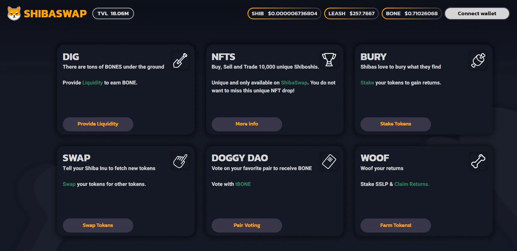 The next evolution in DeFi platforms is ShibaSwap, which combines SHIB, LEASH, and BONE. Using ShibaSwap, users can DIG (provide liquidity), BURY (stake), and SWAP tokens to gain WOOF Returns through a sophisticated and innovative passive income reward system.